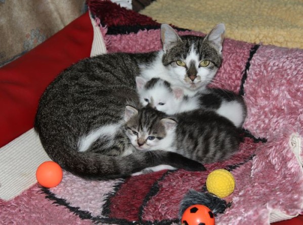 Neue Mitbewohner gibt es auch im Nachbarzimmer der Katzenkinderstube. Katzenmama Susi und ihre Welpen Stan und Stine. Susi ist eine sehr scheue Katze, kümmert sich aber vorbildlich um ihre Babys.
