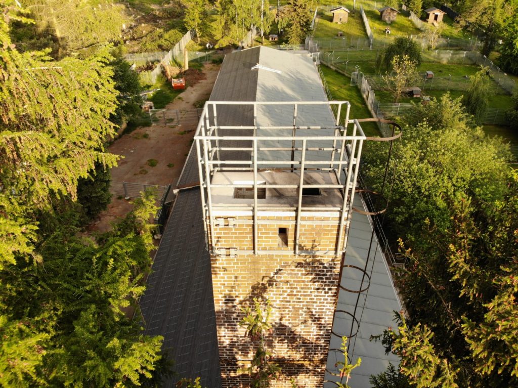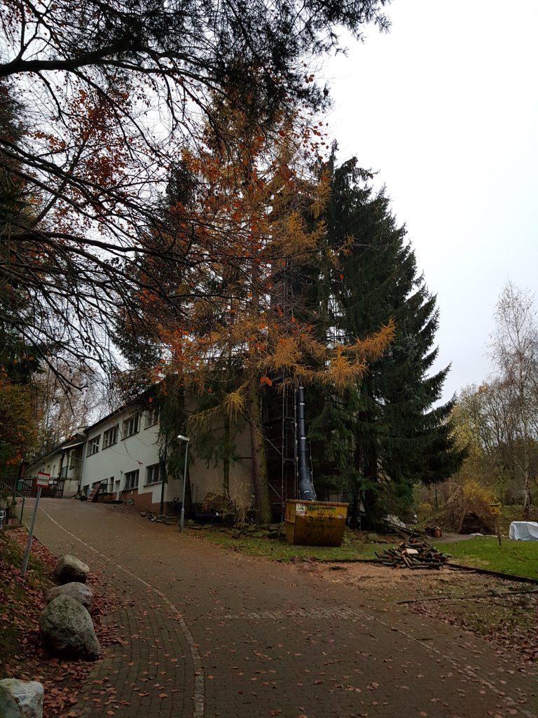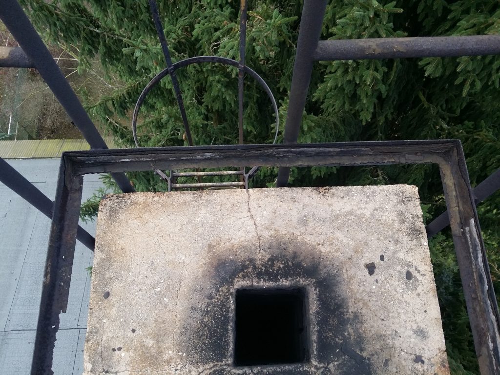 Da unser wohl teilweise weit sichtbare Schornstein aus DDR-Zeiten zwischenzeitlich marode geworden war, musste jener in 2017 nicht nur vollflächig neu verfugt werden, sondern es bedurfte auch eines neu aufgemauerten Essenkopfs sowie einem neuen Geländer.