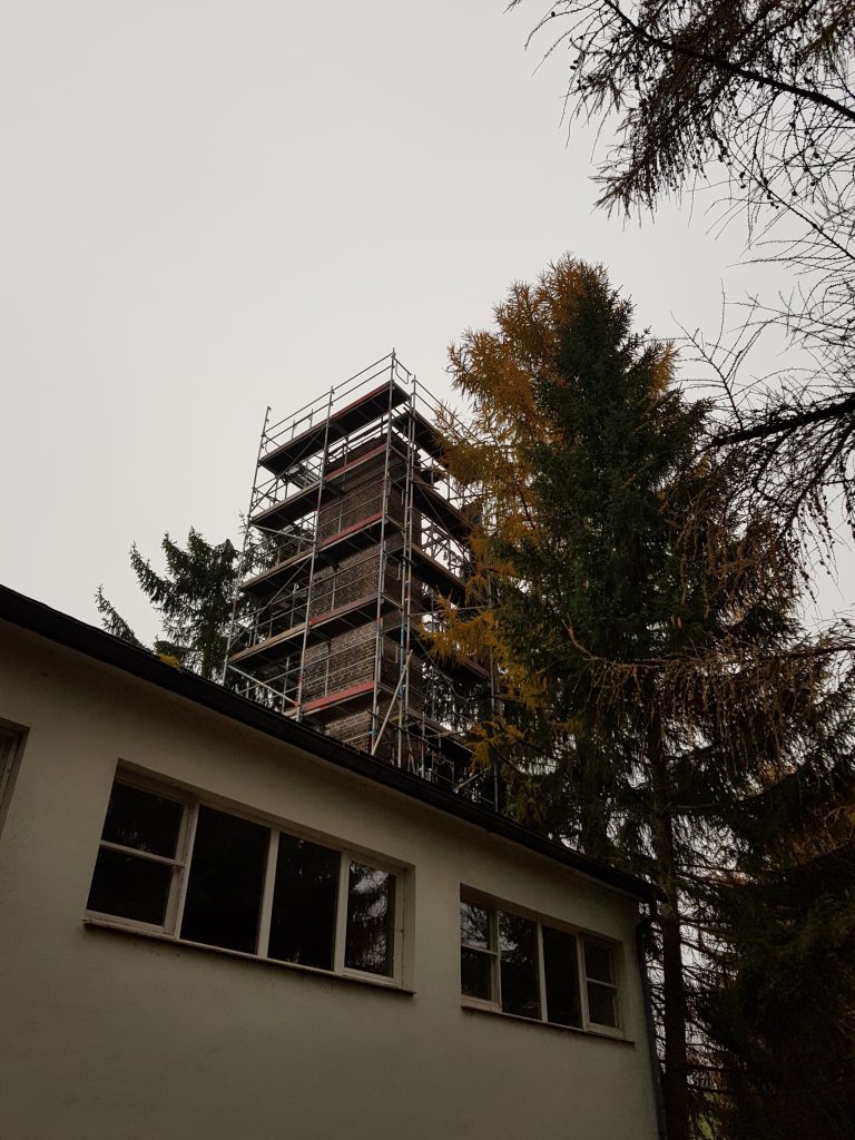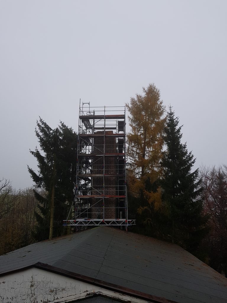Dies war selbsterklärend logistisch etwas umfangreicher, galt es doch den Schornstein vollständig einzurüsten, teilweise Baumrückschnitte vorzunehmen, den Schornstein abzukärchern und teilweise abzutragen, um jenen sodann neu aufzumauern und auszufugen. Zu guter Letzt musste noch das neue Geländer montiert werden.