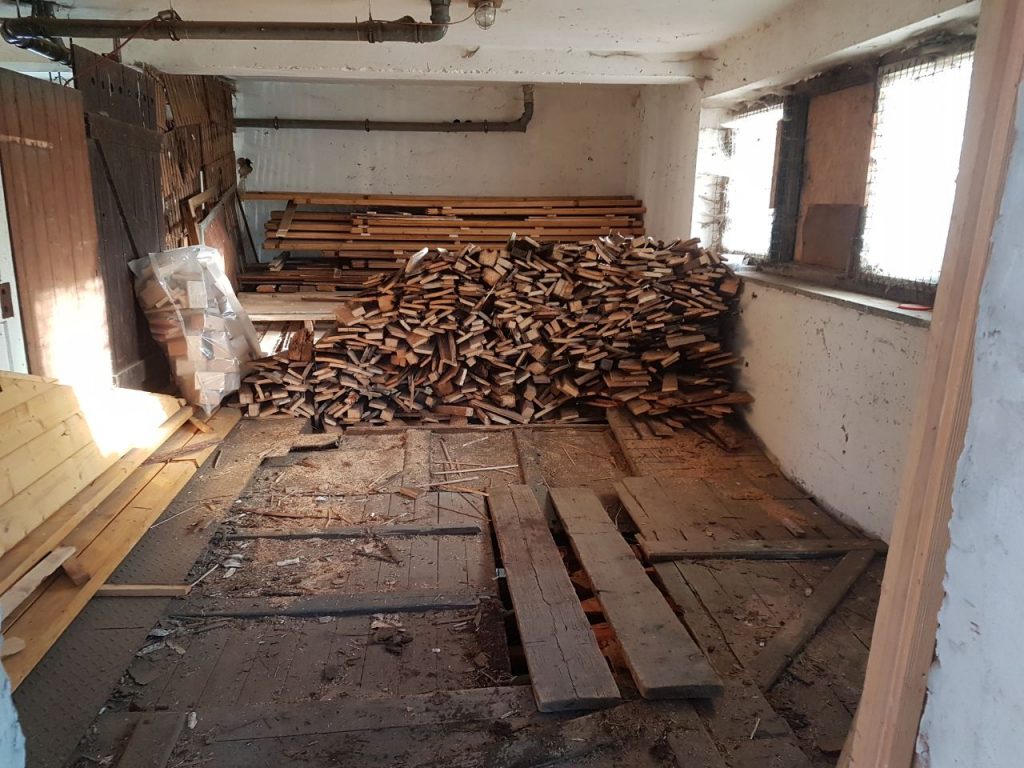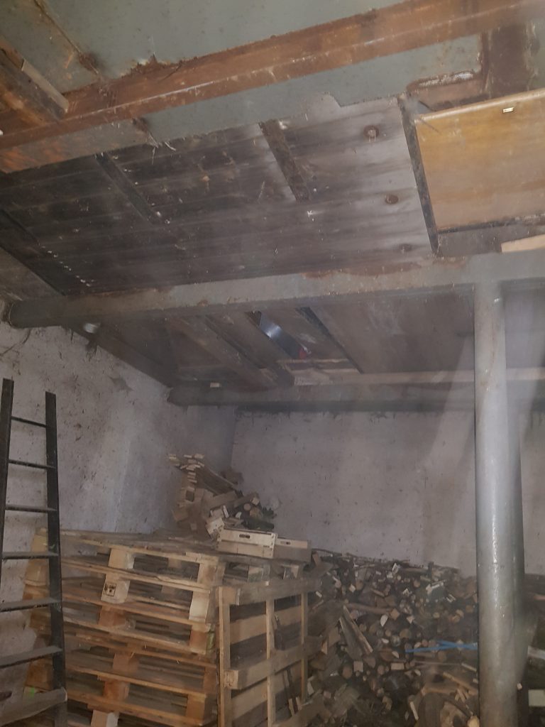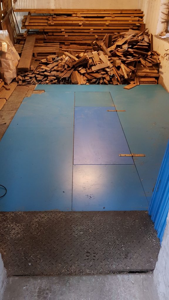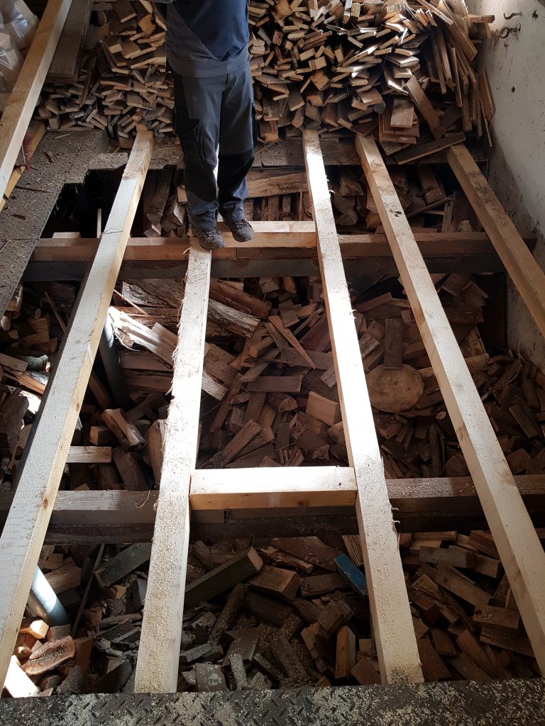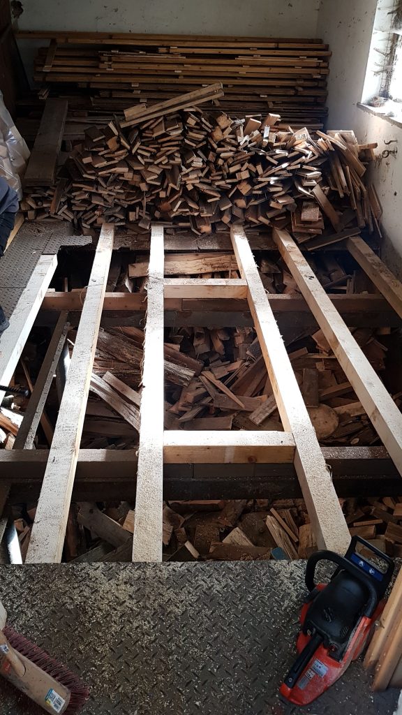 Da der bisherige Zwischenboden mittels provisorischen Holztüren fast schon lebensgefährlich war, galt es in 2018 mittels Eigenleistung einen neuen Zwischenboden mit entsprechender Luke einzuziehen. Hierfür haben wir die Balken günstig erworben, die blauen (robusten) Platten waren eine Spende.