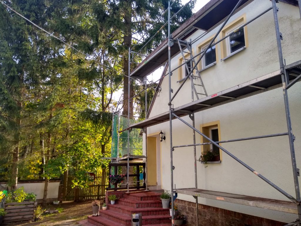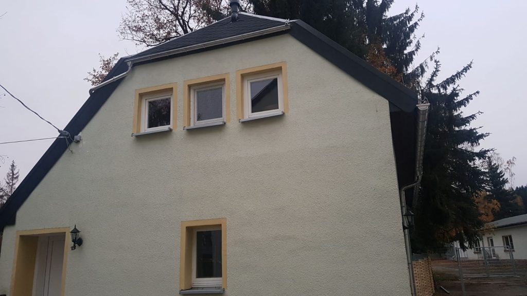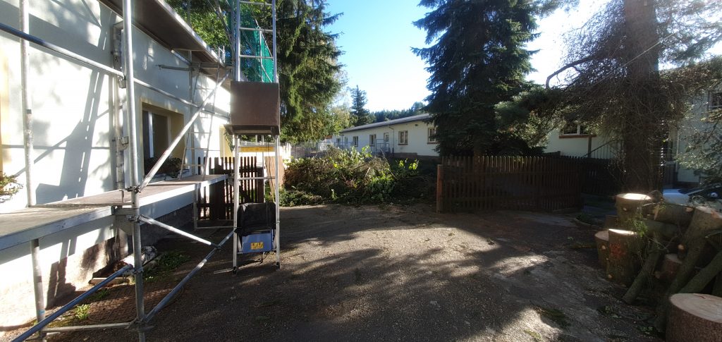Auch das Nebengebäude am Haupthaus, von uns immer Eigenheim genannt, weil zu DDR-Zeiten hier wohl unter anderem auch der Hausmeister drin wohnte, hatte ein völlig marodes Dach, welches nunmehr in 2019 saniert werden musste. Dank Fördermittel der Landesdirektion Sachsen konnten wir hiernach auch die alte Dachhaut aufnehmen und jenes neu mit Schindeln eindecken.
