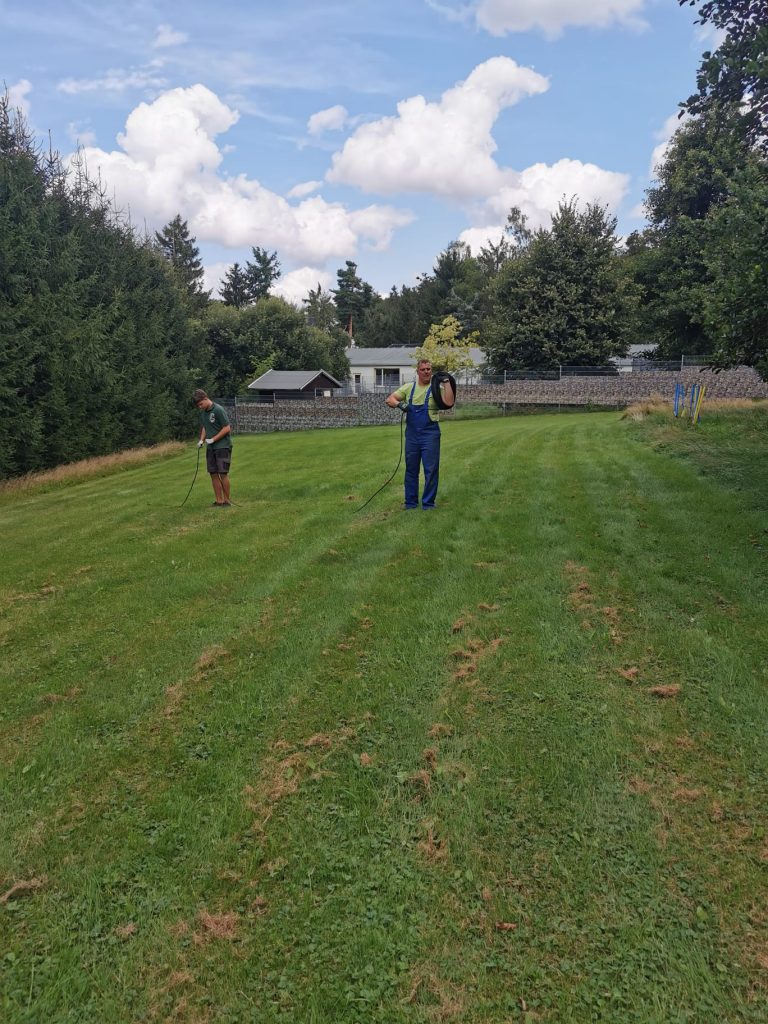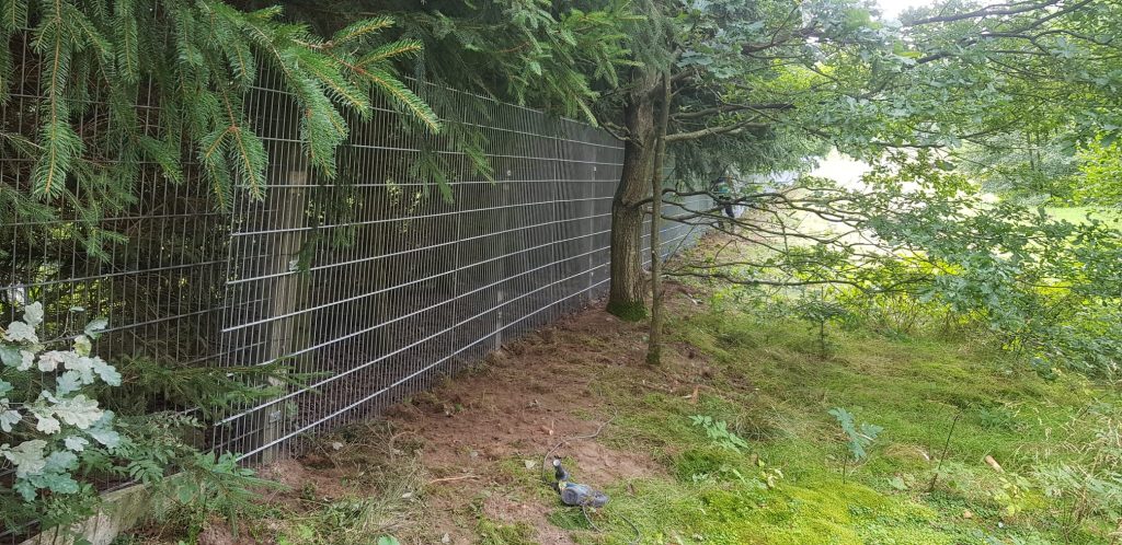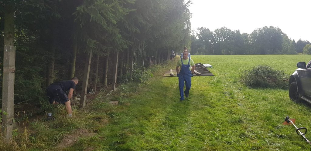 Die Hauptaufgabe bestand wie angekündigt darin, den Holzzaun im großen Hundeauslauf abzubauen und durch die gelieferten Doppelstabmatten zu erneuern, welche wir Dank der Vereinsförderung durch LEADER sowie durch die Spende „unseres“ Imkers Sven Rudolph (Müslener Landimkerei) finanzieren konnten.