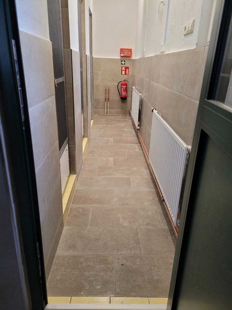 …sondern es ging auch im Inneren weiter voran. Zwischenzeitlich wurde einerseits die Heizung wieder angeklemmt, so dass der Gebäudebereich rechtzeitig in Richtung Winter wieder beheizt werden kann. Andererseits geht es auch mit dem Fliesen stetig voran, man sieht zahlreiche Wände bereits neu sowie auch drei neu eingebaute Schwellen, welche wir aus Gründen der Arbeitssicherheit extra gelb gefliest haben.