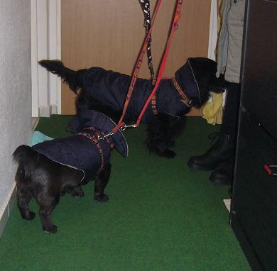 Seit kurzem können die 2 auch 1 Jäckchen anziehen, damit es nicht so kalt ist und der Rücken schön warm bleibt. Das lassen sie sich auch gut gefallen und hübsch sehen sie damit auch noch aus 😉