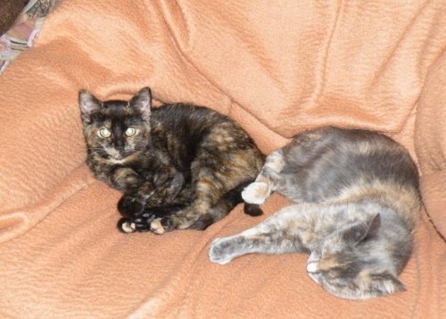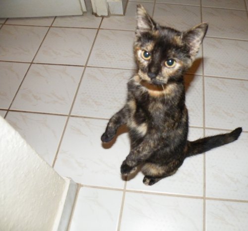So – nun haben wir gaaaaanz fest ein neues Zuhause  aber meiner Mutti Momo und mir war schon lange klar, das wir hier richtig sind. Ach ist das Leben schön, ich kann rumsausen und Mutti ärgern, spiele, klettern, nur mit dem Essen hakt es : immer geben mir die Menschen nur soviel, wie auf den bunten Tüten steht ! Hmmm – ich könnte aber viiiiiel mehr essen 🙂 Von meiner Mutti schaue ich mir jeden, aber jeden Blödsinn ab, Momo ist eine sehr gute Lehrerin 🙂 so haben wir viel Spaß, und schon lange die Herzen der beiden hier erobert. Und schon fangen wir an, richtig aufzutauen und werden immer verschmuster. Momo hat ihren Lieblingsplatz schon entdeckt, was den großen Mann lachend zur Verzweiflung treibt : der Kühlschrank ! Also wenn der Kasten aufgeht, dann sausen wir beide, auch wenn wir grad noch geschlafen haben, schnurstracks hin – ach ist da schönes Zeug drin ! Ich habe hier ganz doll viele Lieblingsplätze, und wenn ich Unfug mache ( zum Beispiel mit den lustigen Bändchen an ihren Füpßen, die sie immer an und ausziehen, weil sie keine eigenen haben – sie nennen das wohl „Schnürsenkel“ – ich sage dazu : SPIELZEUG 🙂 ), schaue ich die beiden mit großen Augen einfach an, und dann lachen alle 🙂 Bis später, eure Mia-Luise & Momo